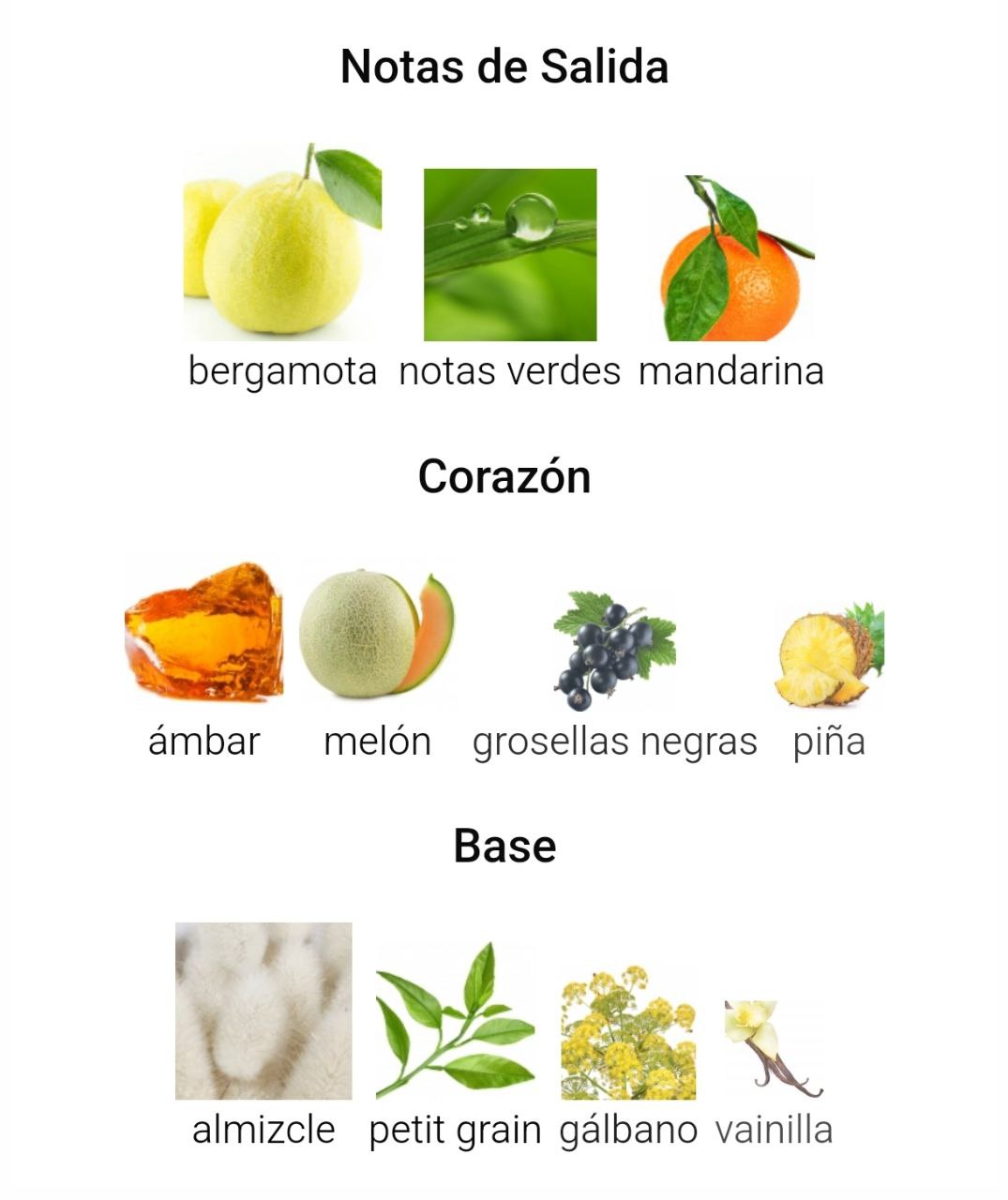Las Notas de Salida son bergamota, notas verdes y mandarina.