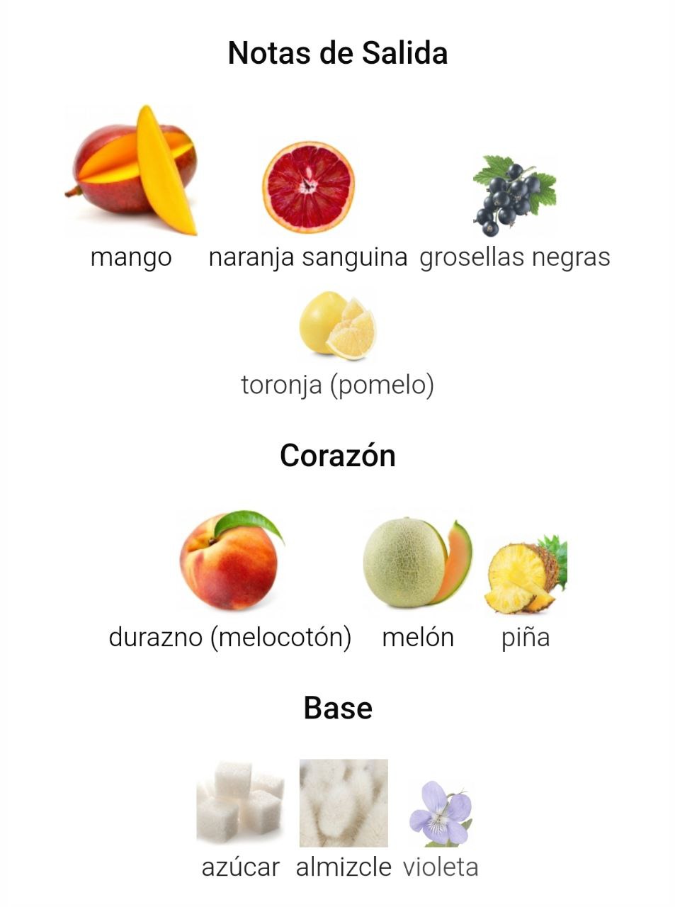 Las Notas de Salida son mango, naranja sanguina, grosellas negras y toronja (pomelo).