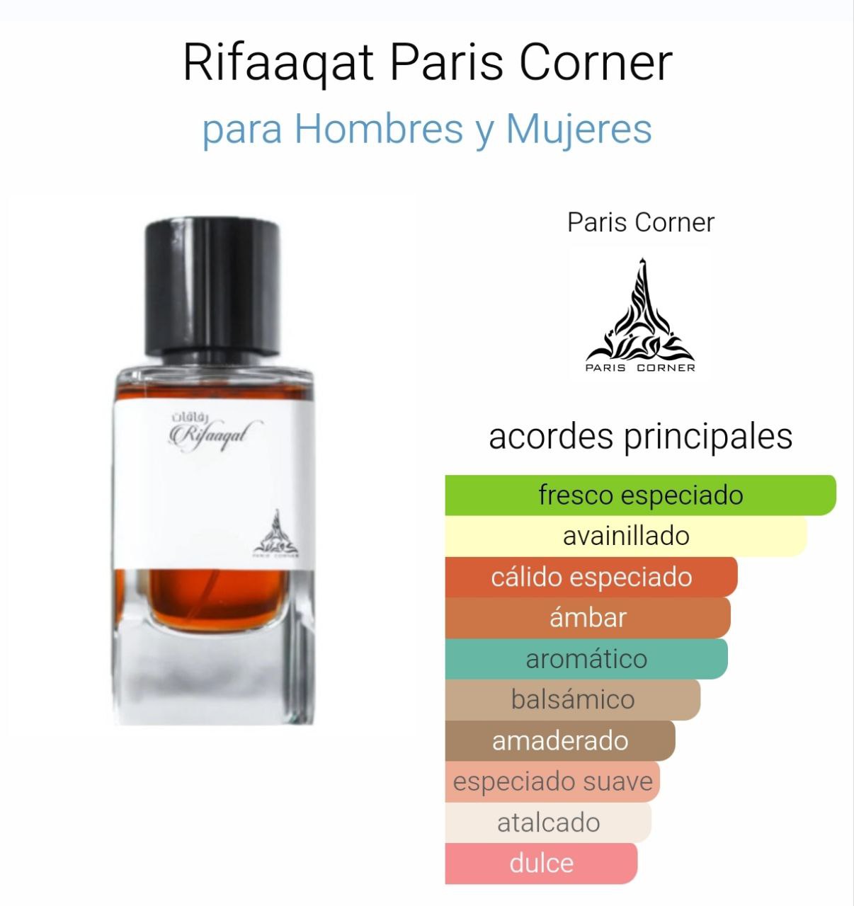 Rifaaqat ofrece una combinación equilibrada de picante, calidez resinosa y profundidad amaderada. La interacción entre las notas de pimienta, olíbano, azafrán y los elementos reconfortantes de vainilla, gamuza y cedro sugiere un aroma versátil y sofisticado.
