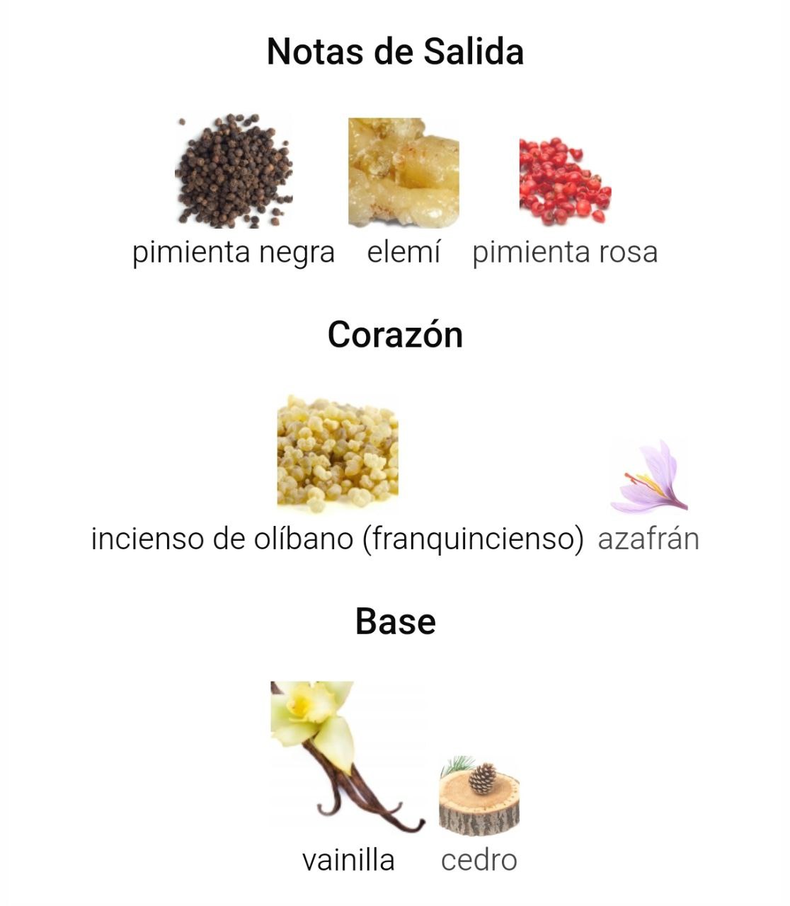Las Notas de Corazón son incienso de olíbano (franquincienso) y azafrán.